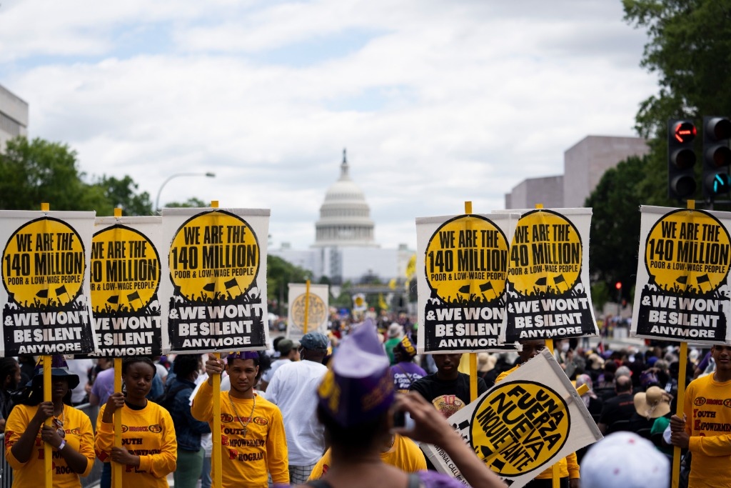 2022年6月18日,來自美國(guó)全國(guó)各地的數(shù)千民眾在華盛頓國(guó)會(huì)大廈附近舉行集會(huì),抗議美國(guó)根深蒂固的種族歧視以及由此引發(fā)的經(jīng)濟(jì)不公等一系列社會(huì)問題。新華社記者劉杰攝