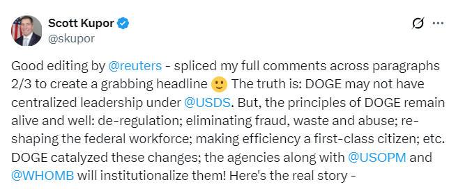 中新網(wǎng)11月24日電 綜合報(bào)道,路透社23日發(fā)布消息稱美國(guó)“政府效率部”提前8個(gè)月解散。對(duì)此,美國(guó)人事管理局局長(zhǎng)庫(kù)珀在社交媒體上發(fā)文回應(yīng)說(shuō),有關(guān)報(bào)道并非實(shí)情,相關(guān)媒體“嫁接了”他的話,“創(chuàng)造了抓人眼球的頭條”。
