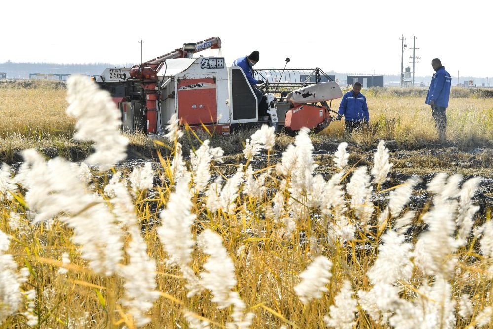 在吉林省大安市海坨鄉(xiāng)鹽堿地生態(tài)修復治理示范基地,農(nóng)民駕駛收割機收割水稻(2022年10月12日攝)。新華社記者 許暢 攝