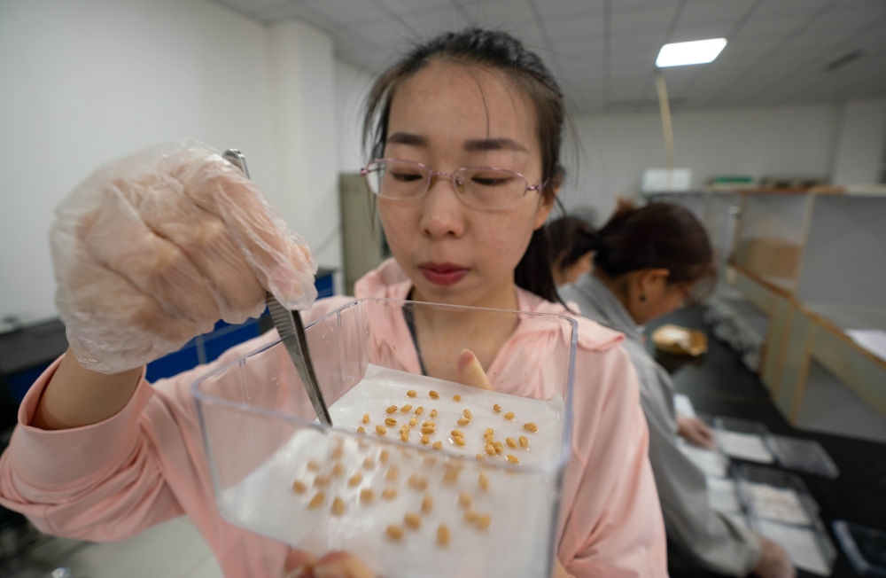 5月25日,在河北滄州渤海新區(qū)黃驊市中捷產(chǎn)業(yè)園區(qū)農(nóng)科所種子檢驗室,技術(shù)人員在做小麥出芽率實驗。新華社記者 駱學峰 攝