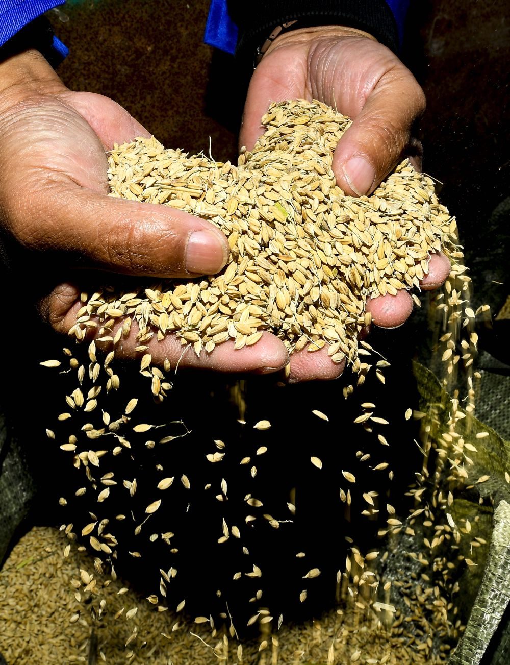 在吉林省大安市海坨鄉(xiāng)鹽堿地生態(tài)修復治理示范基地,農(nóng)民查看收獲的稻谷(2022年10月12日攝)。新華社記者 許暢 攝
