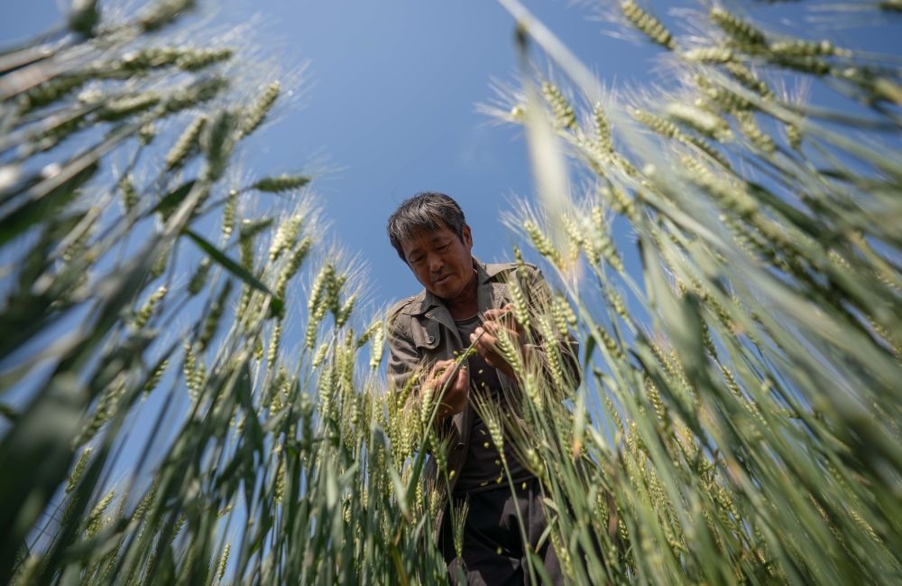 5月19日,在山東省東營市黃河三角洲農(nóng)業(yè)高新技術(shù)產(chǎn)業(yè)示范區(qū),農(nóng)科人員在觀察“濟麥60”的生長情況。新華社記者 徐速繪 攝