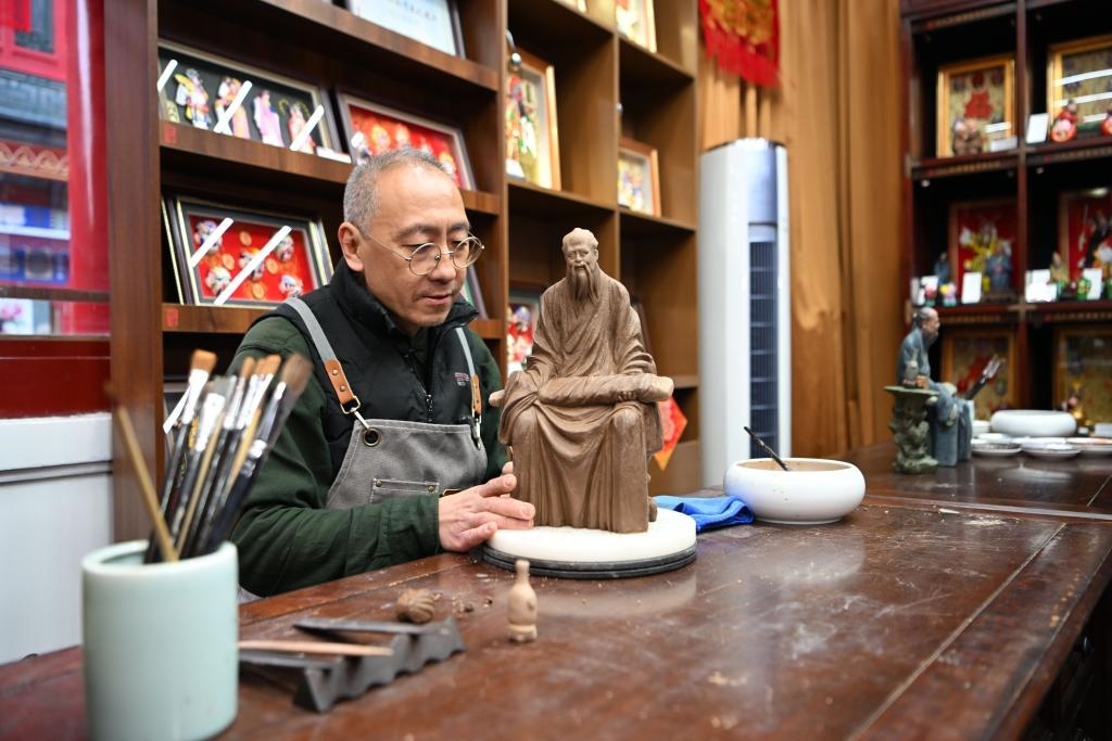 在天津古文化街,泥人張制作部的師傅劉強在店內(nèi)工作。新華社記者李然 攝