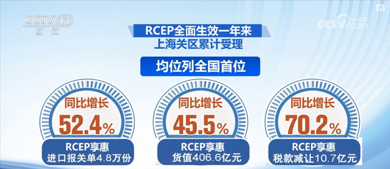 在上海,RCEP全面生效一年來,上海關(guān)區(qū)累計受理RCEP享惠進(jìn)口報關(guān)單4.8萬份,貨值406.6億元,稅款減讓10.7億元,均位列全國首位,同比分別增長52.4%、45.5%和70.2%,