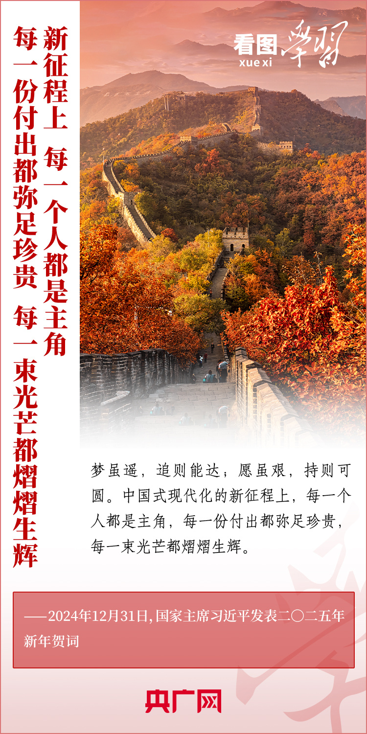 “夢(mèng)雖遙,追則能達(dá);愿雖艱,持則可圓?!毙履昵跋Γ?xí)近平主席發(fā)表二〇二五年新年賀詞。在溫暖有力的講述中,習(xí)主席深情回望過(guò)去一年中國(guó)不平凡的奮斗歷程、精彩瞬間,感慨大家一道經(jīng)歷的風(fēng)雨彩虹、難忘時(shí)刻,贊美無(wú)數(shù)為夢(mèng)想拼搏的勞動(dòng)者、建設(shè)者、創(chuàng)業(yè)者。習(xí)主席說(shuō),中國(guó)式現(xiàn)代化的新征程上,每一個(gè)人都是主角,每一份付出都彌足珍貴,每一束光芒都熠熠生輝。讓我們充滿(mǎn)信心,在新的一年接續(xù)奮斗!