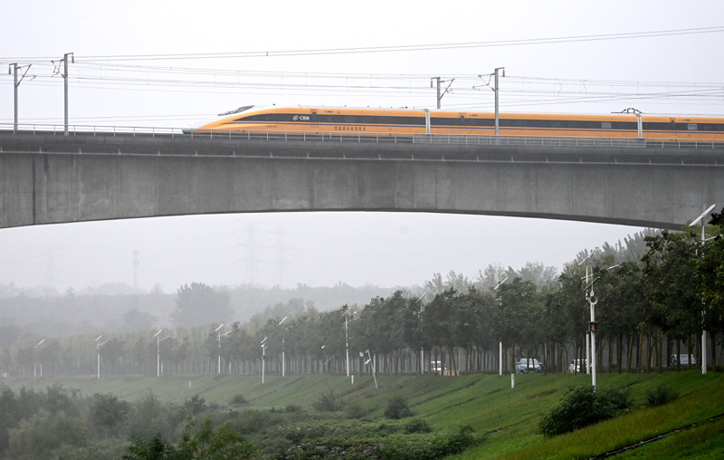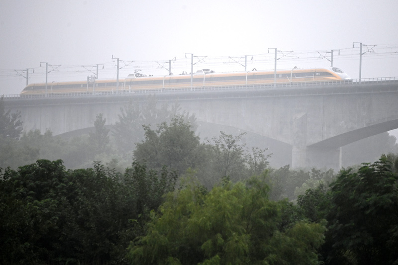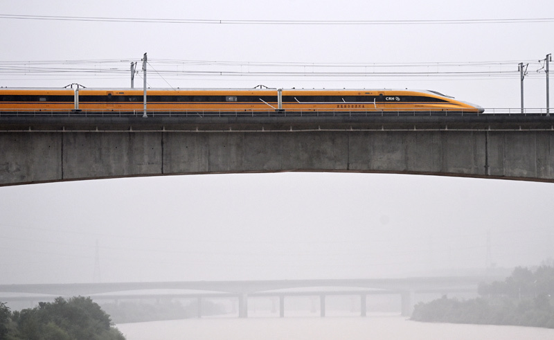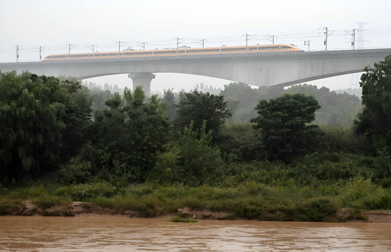 9月11日,聯(lián)調(diào)聯(lián)試綜合檢測(cè)列車(chē)駛過(guò)位于陜西省西安市的西延高鐵渭河特大橋。