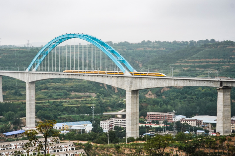9月11日,聯(lián)調(diào)聯(lián)試綜合檢測(cè)列車(chē)駛過(guò)位于陜西省銅川市的西延高鐵王家河特大橋。