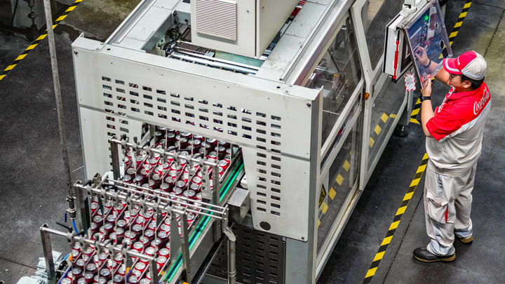 中糧可口可樂飲料(貴州)有限公司的工作人員在生產線旁進行操作(2025年8月24日攝)。新華社記者 陶亮 攝
