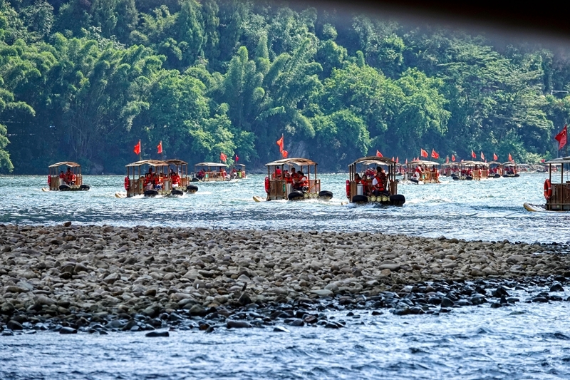 9月13日,在廣西桂林市陽(yáng)朔縣興坪鎮(zhèn),游人在漓江上乘坐竹筏賞景。