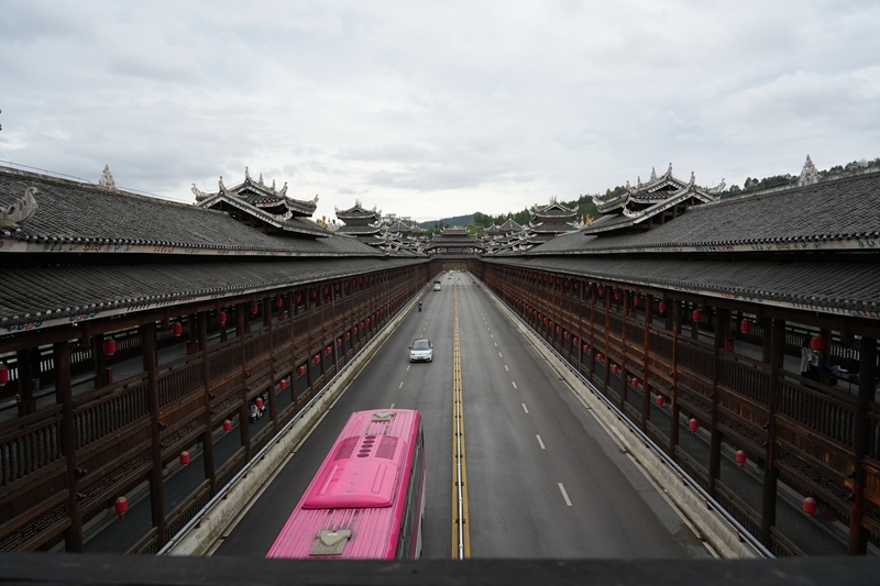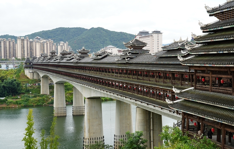這是9月25日拍攝的三江侗族自治縣的程陽永濟橋。該橋建成于1924年,整座橋梁搭建時不用一釘一鉚,主要由木料和石料建成,橋長近80米,寬近4米,高近12米,是我國建筑藝術(shù)中的珍品。