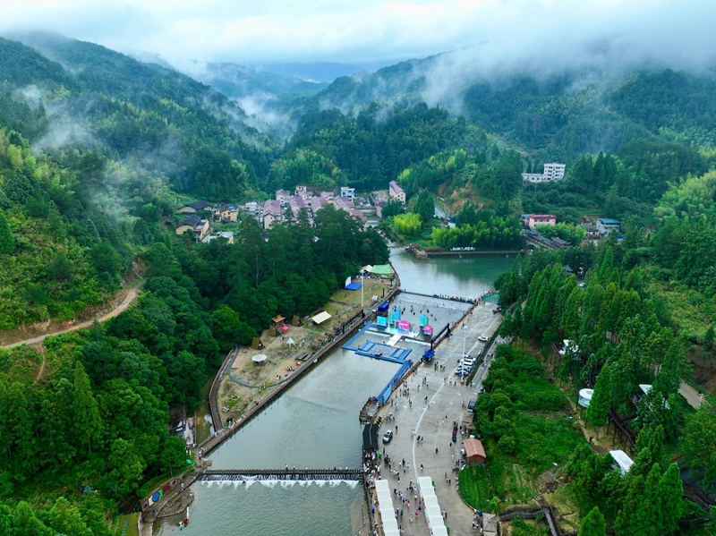 7月18日,山水環(huán)繞的周寧縣泗橋鄉(xiāng)溪口村吸引眾多游客前來消暑度夏(無人機照片)。