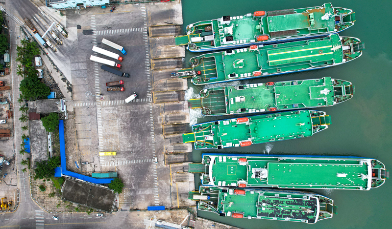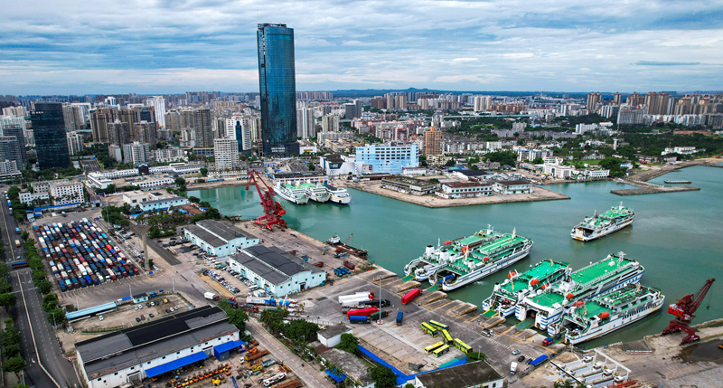 7月22日,在海口市秀英港,車輛有序駛?cè)肟蜐L船(無(wú)人機(jī)照片)。
