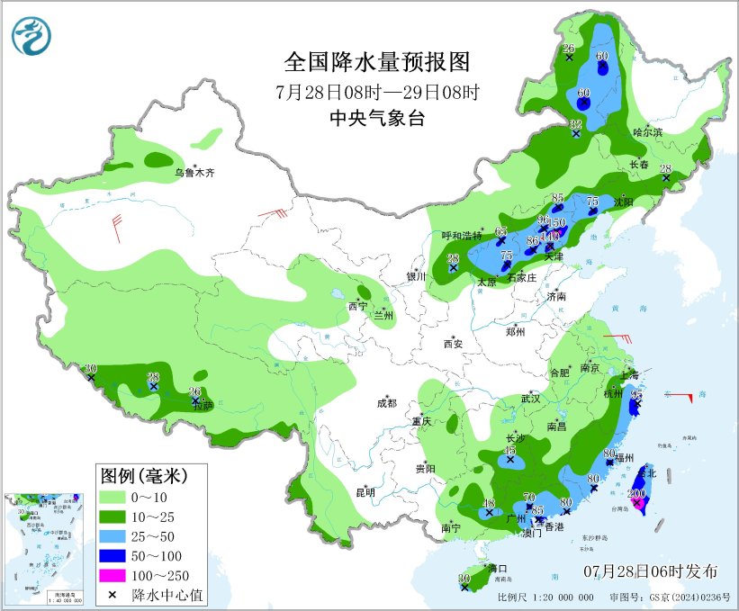 7月28日08時至29日08時,山西中北部、河北中北部、北京、天津中北部、遼寧西部、內(nèi)蒙古中東部、陜西北部以及臺灣島、浙江東部、福建東部和南部、廣東大部、江西南部、湖南南部、廣西東部、海南島西南部、西藏中南部等地的部分地區(qū)有大到暴雨,其中河北中部和東北部、北京北部、天津中北部、臺灣島西部等地的局部地區(qū)有大暴雨(100~200毫米)。新疆南疆盆地和東部、內(nèi)蒙古中東部等地部分地區(qū)有5~6級風(fēng)。東海大部海域、臺灣以東洋面偏南海域、巴士海峽將有7~8級、陣風(fēng)9級的大風(fēng),臺風(fēng)中心經(jīng)過的附近海域風(fēng)力可達(dá)9級、陣風(fēng)10~11級。