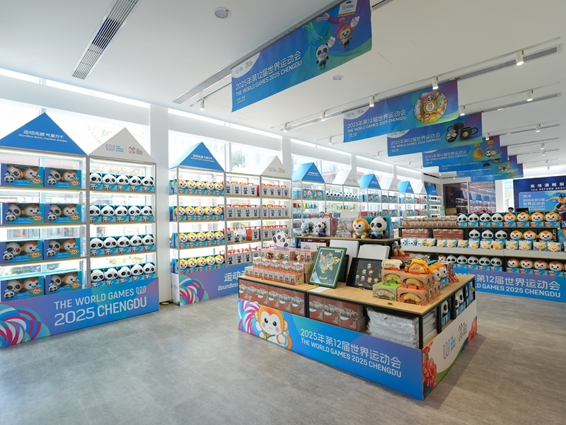 這是8月3日在成都世運會運動員村A區(qū)拍攝的官方特許商品零售店內(nèi)的紀(jì)念品。