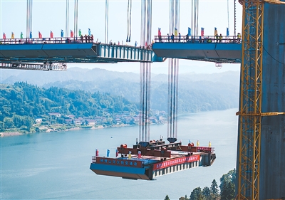 8月3日,由湖南路橋建設集團承建的張官高速控制性工程洞庭溪沅水特大橋主橋順利合龍,為2026年全線通車奠定堅實基礎。張官高速公路北起張家界市永定區(qū),南至懷化市沅陵縣官莊鎮(zhèn),是國家高速公路網(wǎng)呼和浩特—北海高速公路的重要組成部分。圖為大橋施工現(xiàn)場,一塊鋼混結(jié)合梁在被緩緩提升。新華社記者 陳思汗攝