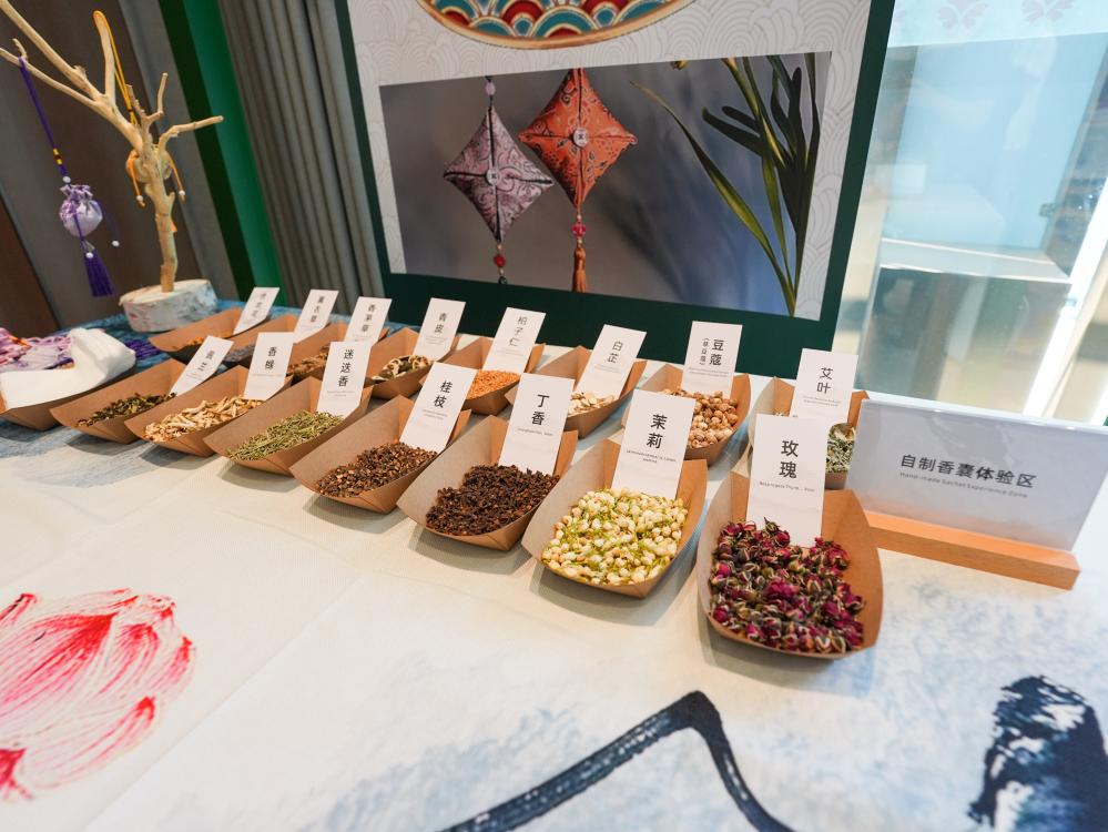 這是8月3日在成都世運(yùn)會運(yùn)動員村A區(qū)中醫(yī)藥體驗館拍攝的自制香囊體驗區(qū)。新華社記者 王曦 攝