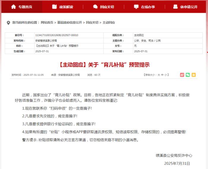 安徽績(jī)溪縣公安局7月31日發(fā)布關(guān)于育兒補(bǔ)貼的預(yù)警提示。