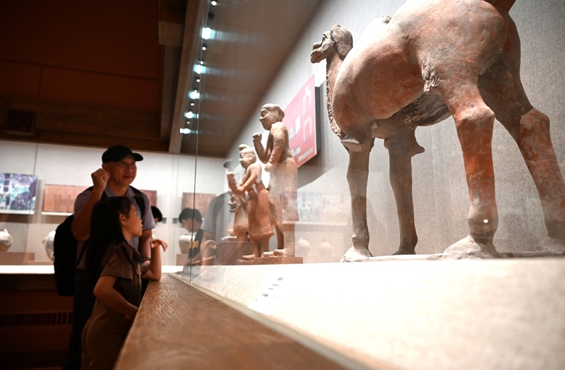 8月10日,家長(zhǎng)帶著孩子在甘肅省敦煌市博物館參觀文物展。
