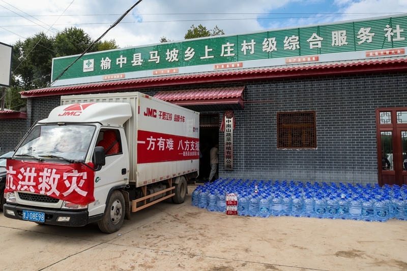 8月10日,一輛載著救援物資的車(chē)輛??吭谟苤锌h馬坡鄉(xiāng)上莊村臨時(shí)安置點(diǎn)。