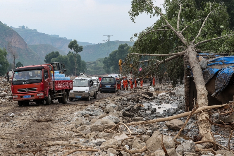 8月9日,在榆中縣馬坡鄉(xiāng)馬蓮灘村,救災(zāi)車(chē)輛行駛在路上。