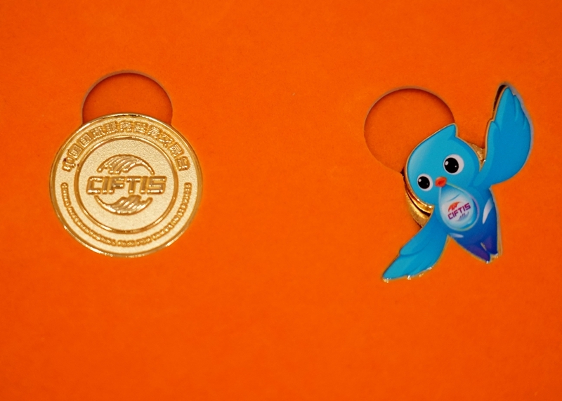 這是8月11日在2025年服貿會媒體吹風會現場拍攝的服貿會特許商品。