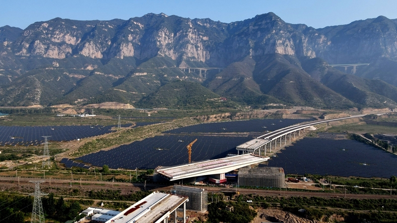 這是8月11日拍攝的河南省濟源市沿太行山高速公路跨焦柳鐵路立交橋轉(zhuǎn)體施工現(xiàn)場(無人機照片)。