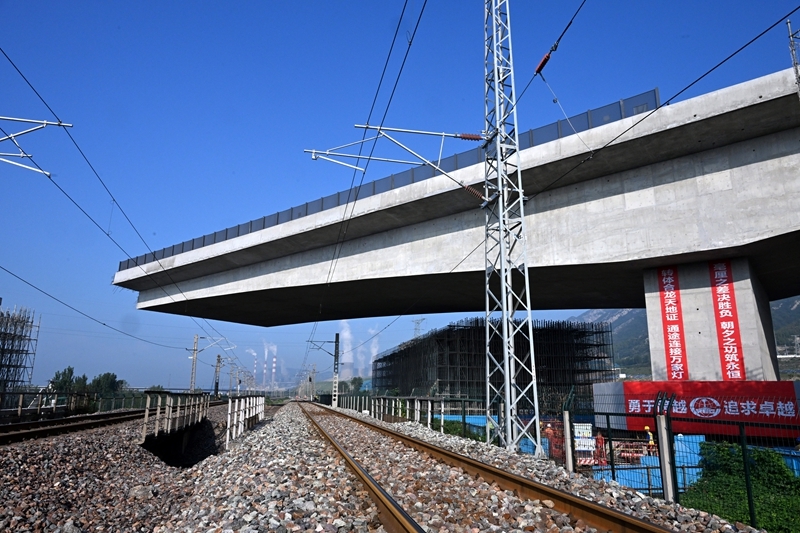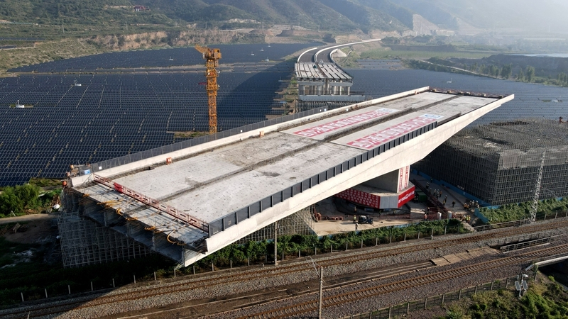 這是8月11日拍攝的河南省濟源市沿太行山高速公路跨焦柳鐵路立交橋轉(zhuǎn)體施工現(xiàn)場。