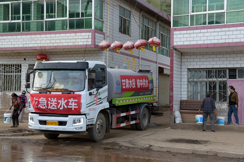 8月11日,在榆中縣城關鎮(zhèn)興隆山村,當?shù)厮畡詹块T為村民送去飲用水。