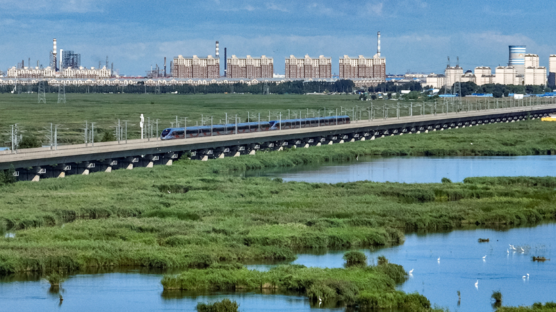 8月17日,復(fù)興號動車組列車行駛在哈齊高鐵線上(無人機(jī)照片)。