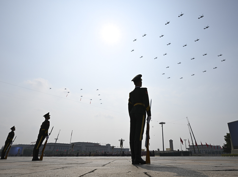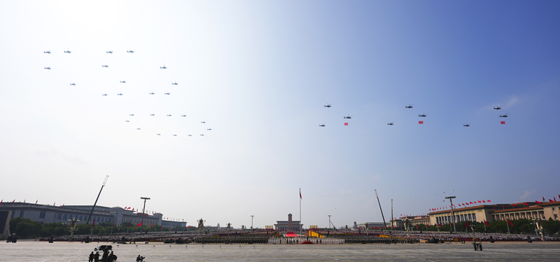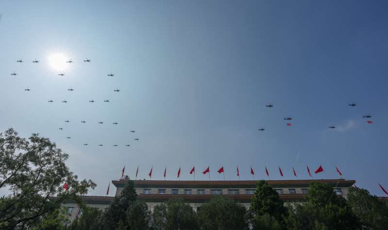 9月3日,紀(jì)念中國人民抗日戰(zhàn)爭暨世界反法西斯戰(zhàn)爭勝利80周年大會在北京隆重舉行。這是空中護(hù)旗梯隊(duì)飛過天安門廣場上空,26架直升機(jī)匯成巨大的“80”字樣。
