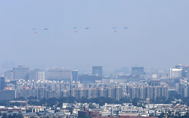 9月3日,紀(jì)念中國人民抗日戰(zhàn)爭暨世界反法西斯戰(zhàn)爭勝利80周年大會在北京隆重舉行。這是空中護(hù)旗梯隊(duì)。