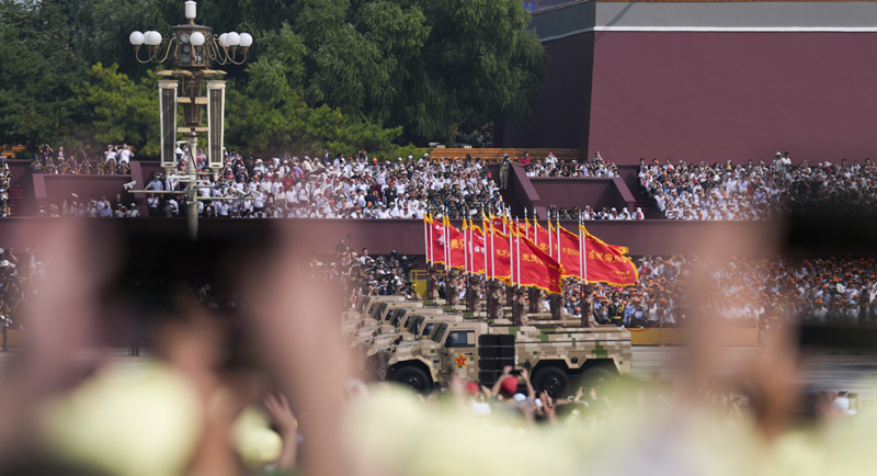 9月3日,紀(jì)念中國人民抗日戰(zhàn)爭暨世界反法西斯戰(zhàn)爭勝利80周年大會在北京隆重舉行。這是戰(zhàn)旗方隊(duì)通過天安門廣場。