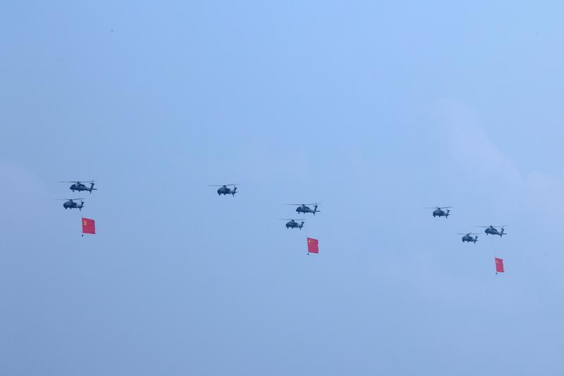 9月3日,紀念中國人民抗日戰(zhàn)爭暨世界反法西斯戰(zhàn)爭勝利80周年大會在北京隆重舉行。這是空中護旗梯隊飛過天安門廣場上空,26架直升機匯成巨大的“80”字樣。