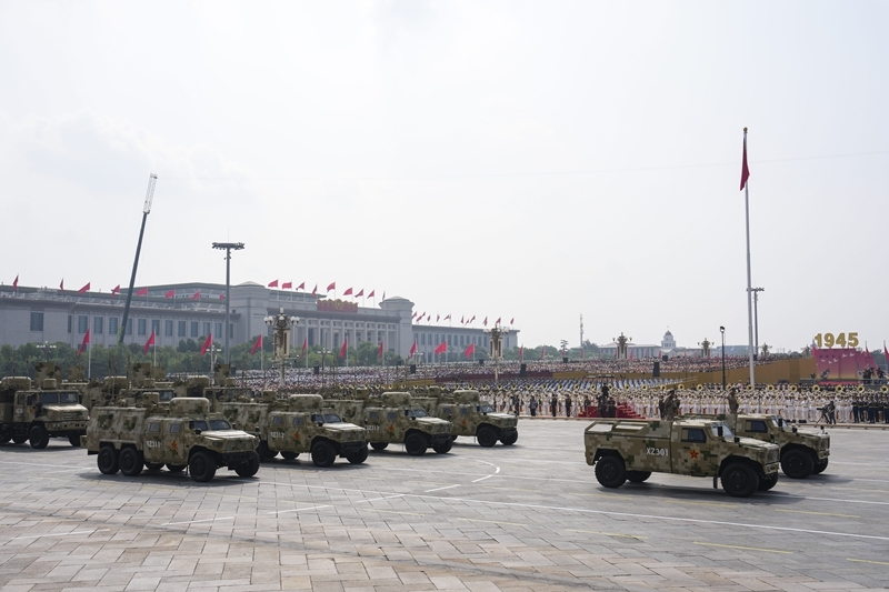 9月3日,紀(jì)念中國(guó)人民抗日戰(zhàn)爭(zhēng)暨世界反法西斯戰(zhàn)爭(zhēng)勝利80周年大會(huì)在北京隆重舉行。這是裝備保障方隊(duì)接受檢閱。