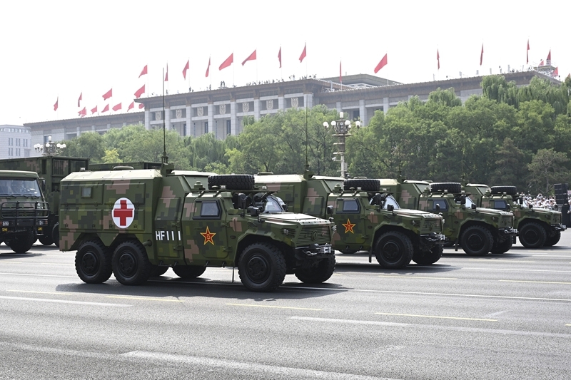 9月3日,紀(jì)念中國人民抗日戰(zhàn)爭暨世界反法西斯戰(zhàn)爭勝利80周年大會(huì)在北京隆重舉行。這是后勤保障方隊(duì)接受檢閱。