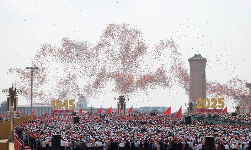 9月3日,紀(jì)念中國人民抗日戰(zhàn)爭暨世界反法西斯戰(zhàn)爭勝利80周年大會(huì)在北京隆重舉行。這是紀(jì)念大會(huì)現(xiàn)場(chǎng)放飛氣球。