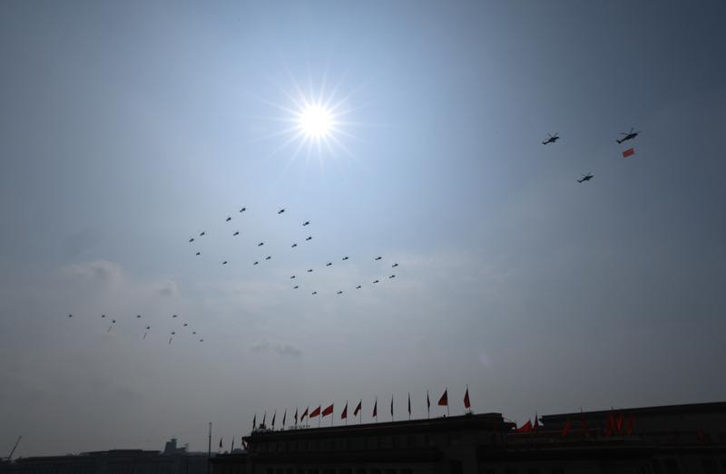 9月3日,紀(jì)念中國(guó)人民抗日戰(zhàn)爭(zhēng)暨世界反法西斯戰(zhàn)爭(zhēng)勝利80周年大會(huì)在北京隆重舉行。這是空中護(hù)旗梯隊(duì)通過(guò)天安門(mén)廣場(chǎng)。