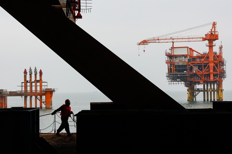 9月8日,工人在墾利6-1油田10-1北區(qū)塊Ⅱ期開(kāi)發(fā)項(xiàng)目油氣平臺(tái)安裝作業(yè)現(xiàn)場(chǎng)施工。