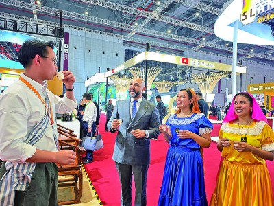 第八屆進(jìn)博會(huì)老撾展廳,工作人員邀請(qǐng)薩爾瓦多游客品茶。本報(bào)記者 范天培攝/光明圖片