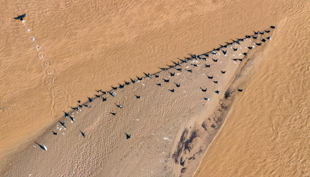 11月4日,在位于寧夏靈武市境內(nèi)的黃河,候鳥在河灘上駐足棲息(無(wú)人機(jī)照片)。新華社記者 楊植森 攝