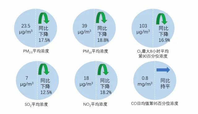 10月,全國339個地級及以上城市PM2.5平均濃度為23.5微克/立方米,同比下降17.5%;PM10平均濃度為39微克/立方米,同比下降18.8%;O3平均濃度為103微克/立方米,同比下降16.9%;SO2平均濃度為7微克/立方米,同比下降12.5%;NO2平均濃度為18微克/立方米,同比下降18.2%;CO平均濃度為0.8毫克/立方米,同比持平。