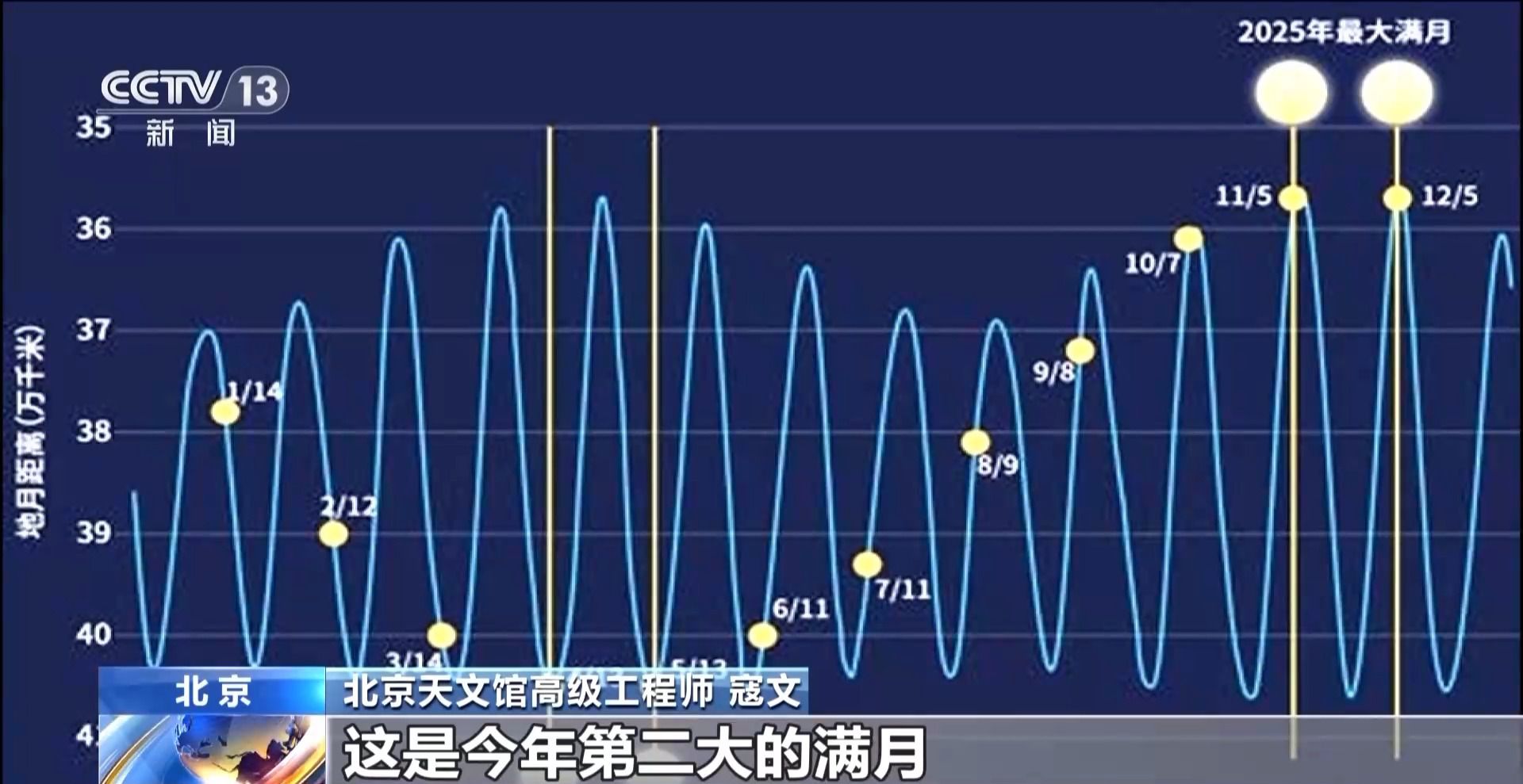 北京天文館高級工程師 寇文:12月5日大約早晨7點(diǎn)14分是滿月,而月亮過近地點(diǎn)的時(shí)間是在這之前大約12個(gè)小時(shí),這是今年第二大的滿月,也可以算是一次“超級月亮”。