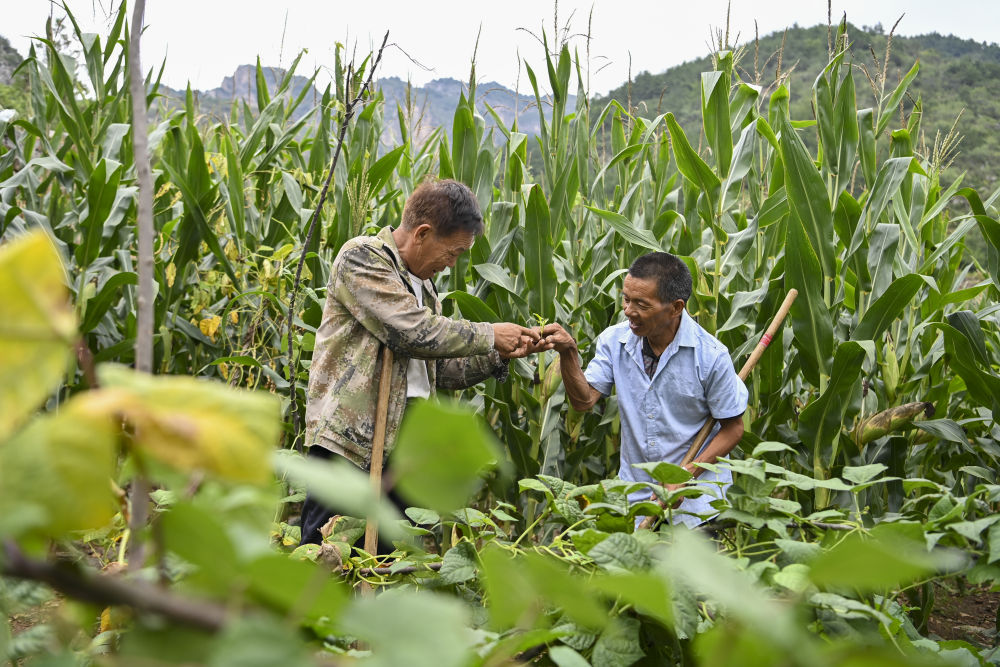 ↑村民桑建平(左)為秦海松夾菜(2025年8月27日攝)。