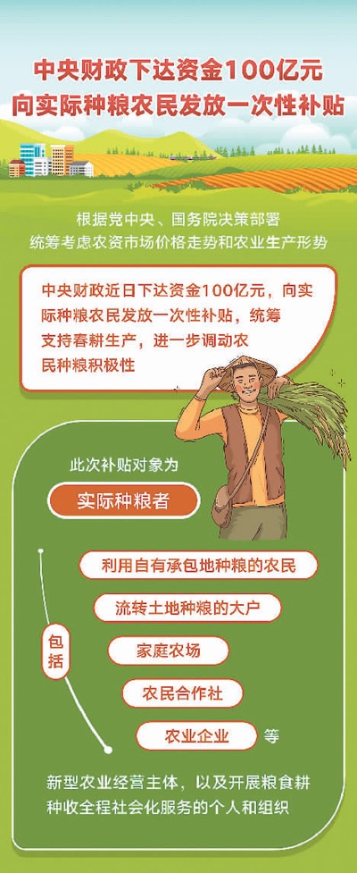 為此,國(guó)家統(tǒng)籌考慮農(nóng)資市場(chǎng)價(jià)格走勢(shì)和農(nóng)業(yè)生產(chǎn)形勢(shì),中央財(cái)政向?qū)嶋H種糧農(nóng)民發(fā)放一次性補(bǔ)貼100億元,以穩(wěn)定農(nóng)民收入、保護(hù)農(nóng)民種糧積極性。