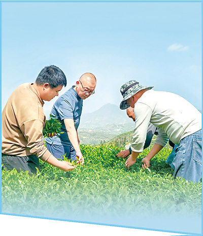 江岔村駐村第一書記陳毓(左二)在高山茶園查看茶葉品質(zhì)。