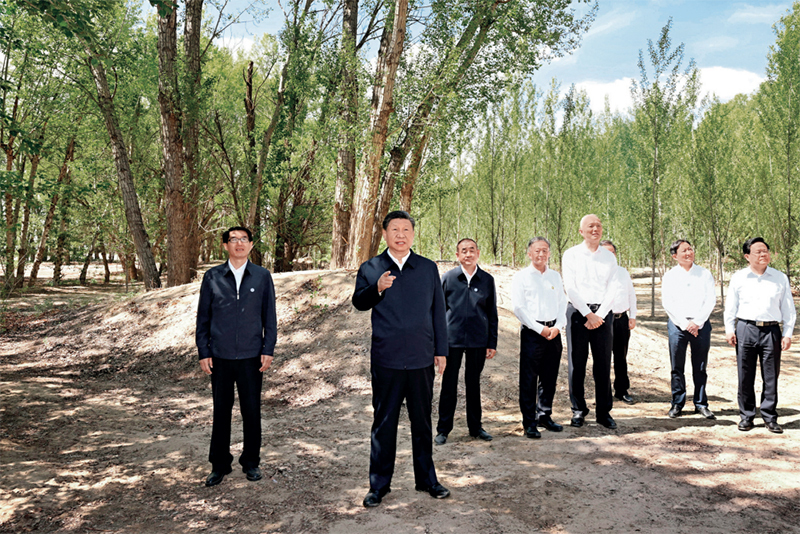 2023年6月5日至6日,中共中央總書記、國家主席、中央軍委主席習近平在內蒙古巴彥淖爾考察,并主持召開加強荒漠化綜合防治和推進“三北”等重點生態(tài)工程建設座談會。這是6日上午,習近平在臨河區(qū)國營新華林場考察。新華社記者 謝環(huán)馳/攝