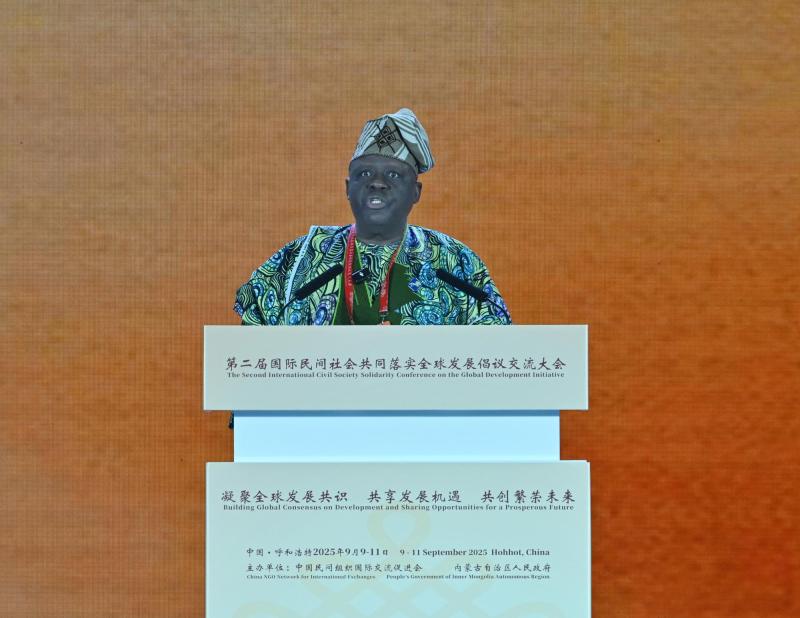 9月10日,貝寧國(guó)民議會(huì)議長(zhǎng)弗拉沃努在第二屆國(guó)際民間社會(huì)共同落實(shí)全球發(fā)展倡議交流大會(huì)開幕式上致辭。草原云·內(nèi)蒙古新聞網(wǎng)記者 馬建兵 攝