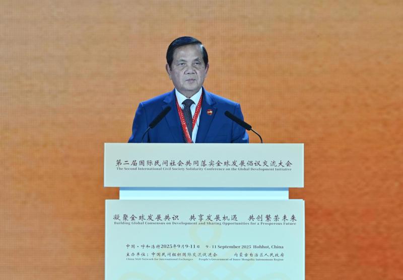 9月10日,柬埔寨參議院第一副主席吳波烈在第二屆國(guó)際民間社會(huì)共同落實(shí)全球發(fā)展倡議交流大會(huì)開幕式上致辭。草原云·內(nèi)蒙古新聞網(wǎng)記者 馬建兵 攝