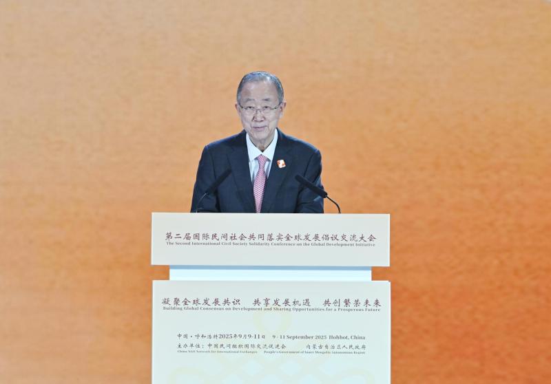 9月10日,聯(lián)合國(guó)第八任秘書長(zhǎng)潘基文在第二屆國(guó)際民間社會(huì)共同落實(shí)全球發(fā)展倡議交流大會(huì)開幕式上致辭。草原云·內(nèi)蒙古新聞網(wǎng)記者 馬建兵 攝