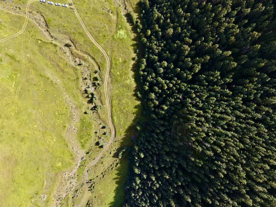 航拍視角下的山林與草甸過渡帶